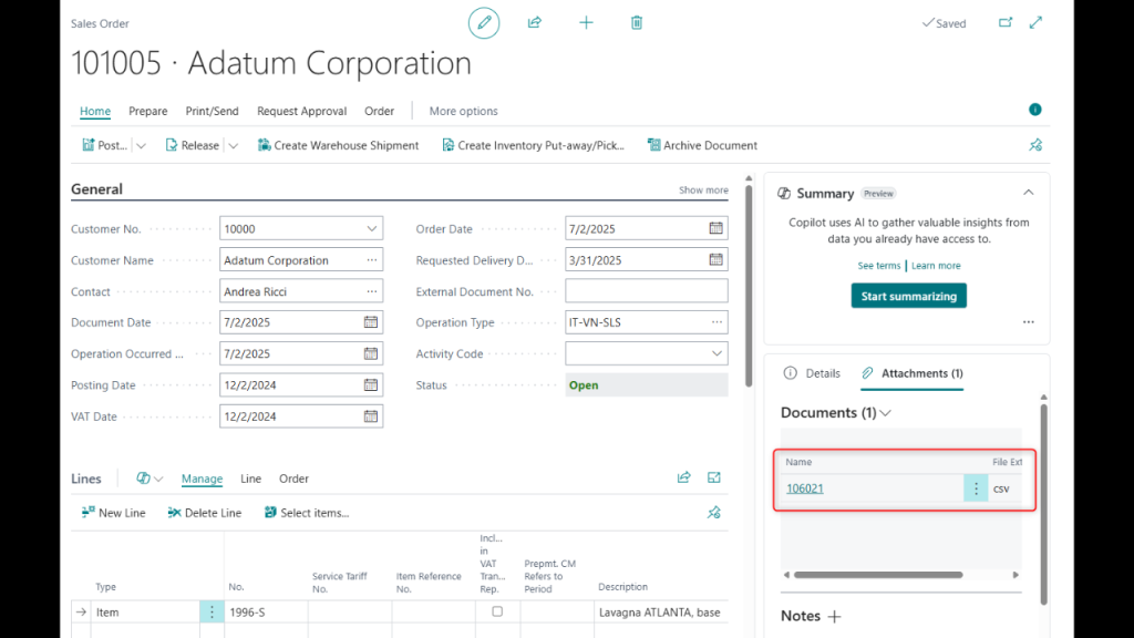 Gli utenti possono continuare a gestire gli allegati come di consueto, semplicemente trascinando e rilasciando i file nelle schede di Business Central. Il processo è completamente trasparente, mentre il sistema ottimizza lo spazio di archiviazione in background.