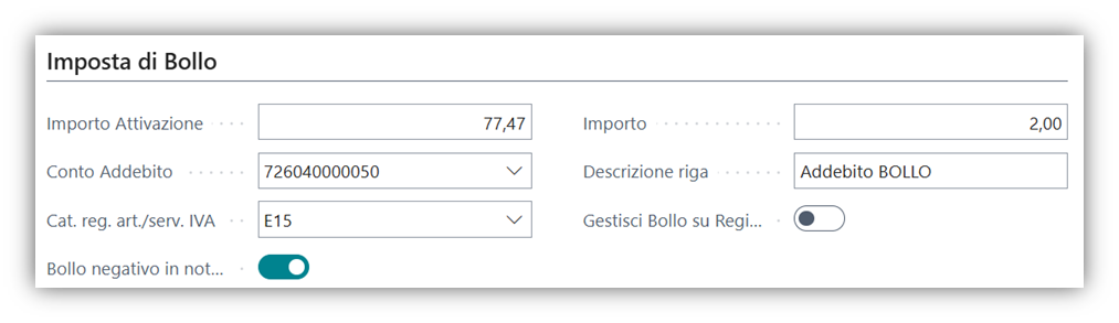 • Importo Attivazione: è l’importo minimo che il documento deve avere per far sì che venga attribuito il bollo. Questo valore viene inserito nel momento in cui l’estensione viene installata.