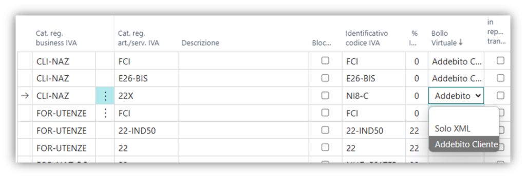 Nella pagina Setup Registrazione Iva ttraverso il campo Bollo virtuale è possibile decidere, per ogni incrocio in cui è previsto il bollo, la relativa gestione: